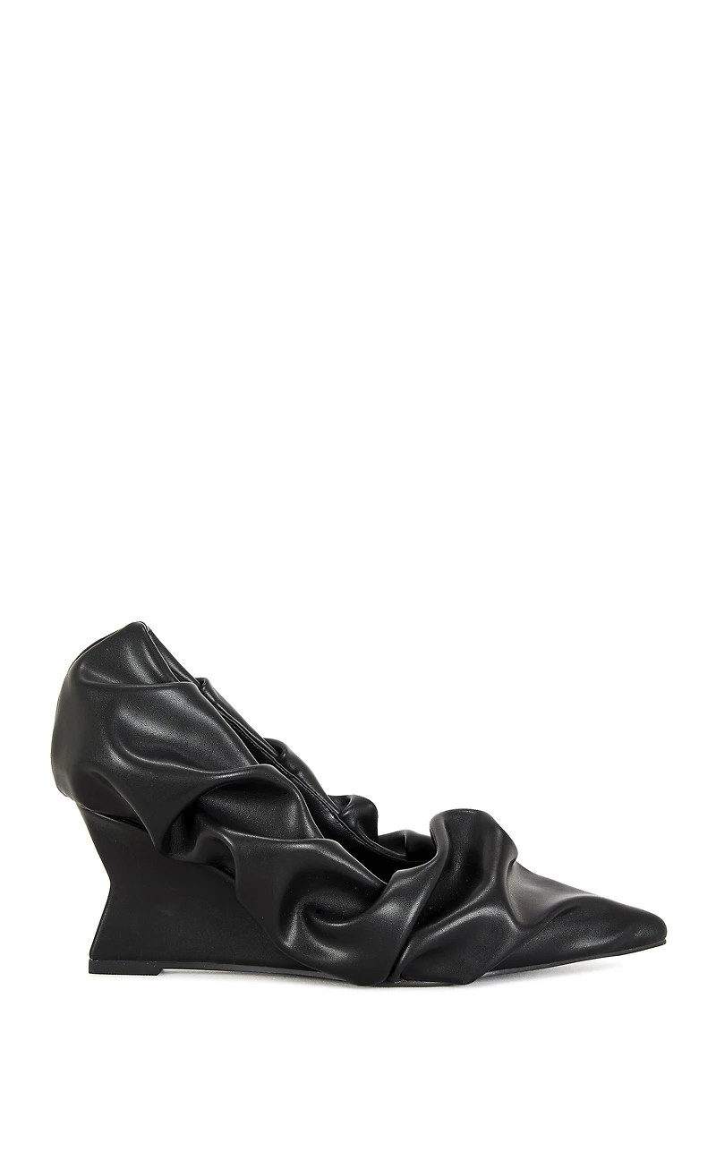 Shoes imitate art. Black faux leather wedge pump with a pointed toe and sculptural draped overlay, a striking architectural design that feels like wearable art.