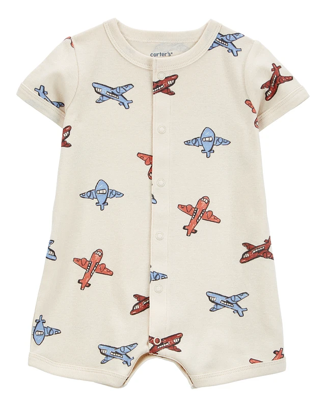 Baby Airplane-Print Ribbed Short-Sleeve Romper - Cream