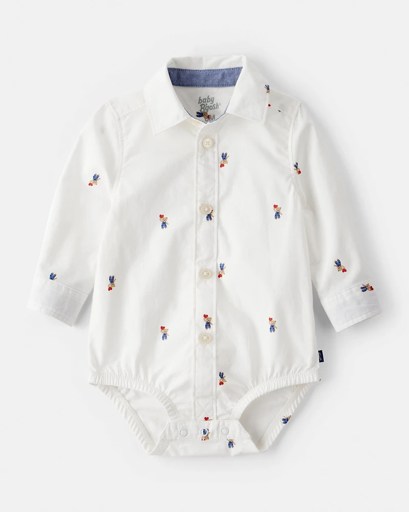 Classic details meet fun design in this button-down bodysuit. Long sleeves, a collar, and chambray lining give it an elevated look while snaps at the legs make dressing smooth and simple. The elastic crotch moves with him, so comfort is never a question. Finished with an all-over bear print featuring bears dressed in overalls holding hearts, it strikes the perfect balance of stylish and cool.