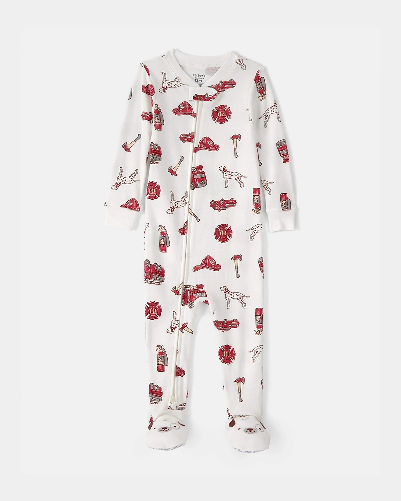 Baby Boy Firetruck 100% Cotton Snug Fit 1-Piece Pajama Set - White