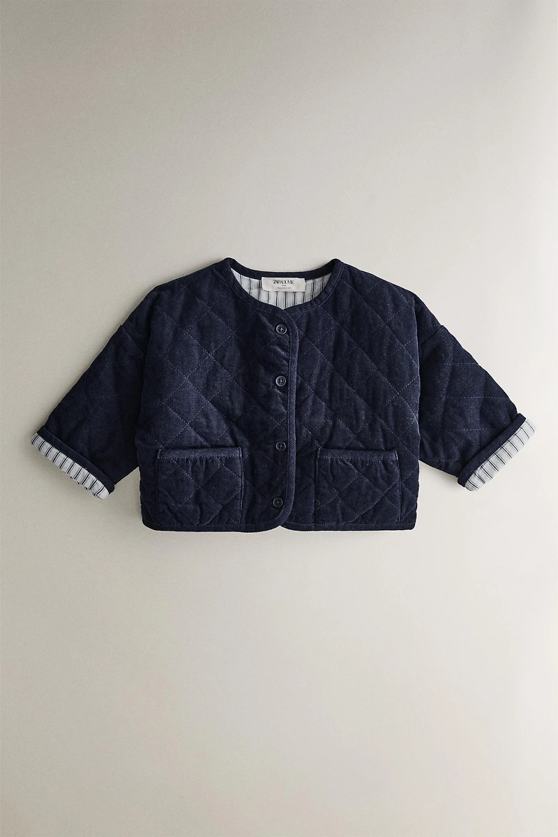 Baby's corduroy jacket with contrast topstitching details and striped sleeve cuffs. Features button fastening and front pockets.