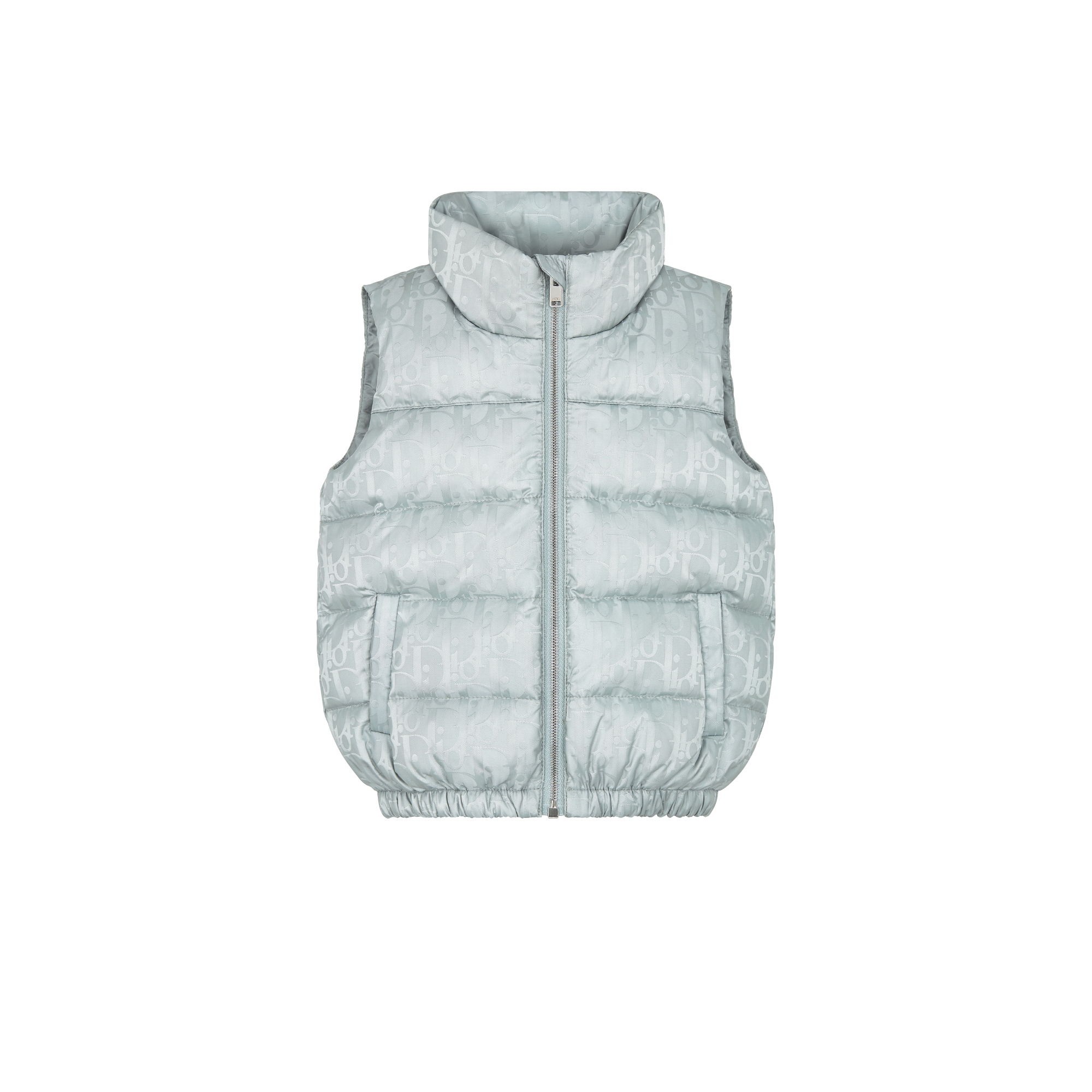 The down vest, inspired by Dior Men, pays tribute to the House's heritage with the hallmark Dior Oblique motif. Crafted in silver-tone technical fabric with an allover tonal jacquard, it features insulating technical down for added warmth. Accented by a Dior soft patch on the back of the collar, the water-repellent down vest will lend a graphic touch to any outfit.