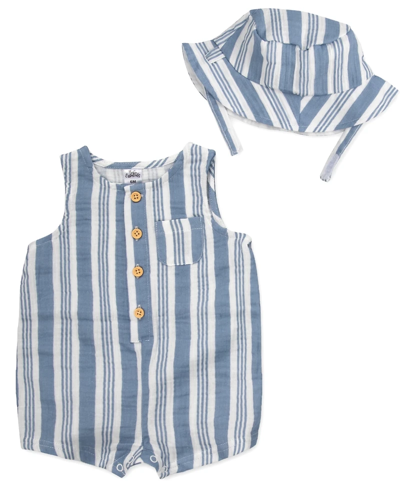 Baby Essentials Boys' Striped Gauze Sleeveless Romper and Hat, 2-Piece Set