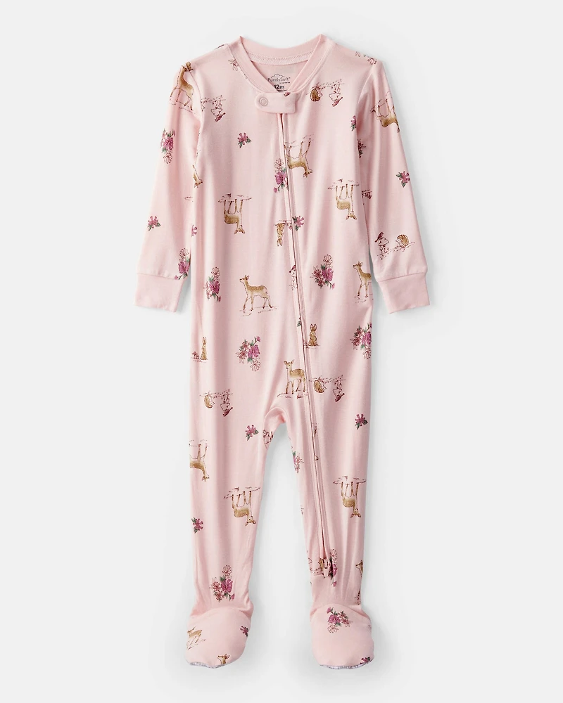 Baby Girl Deer & Floral Print PurelySoft Long-Sleeve 2-Way Zip 1-Piece Pajamas - Pink
