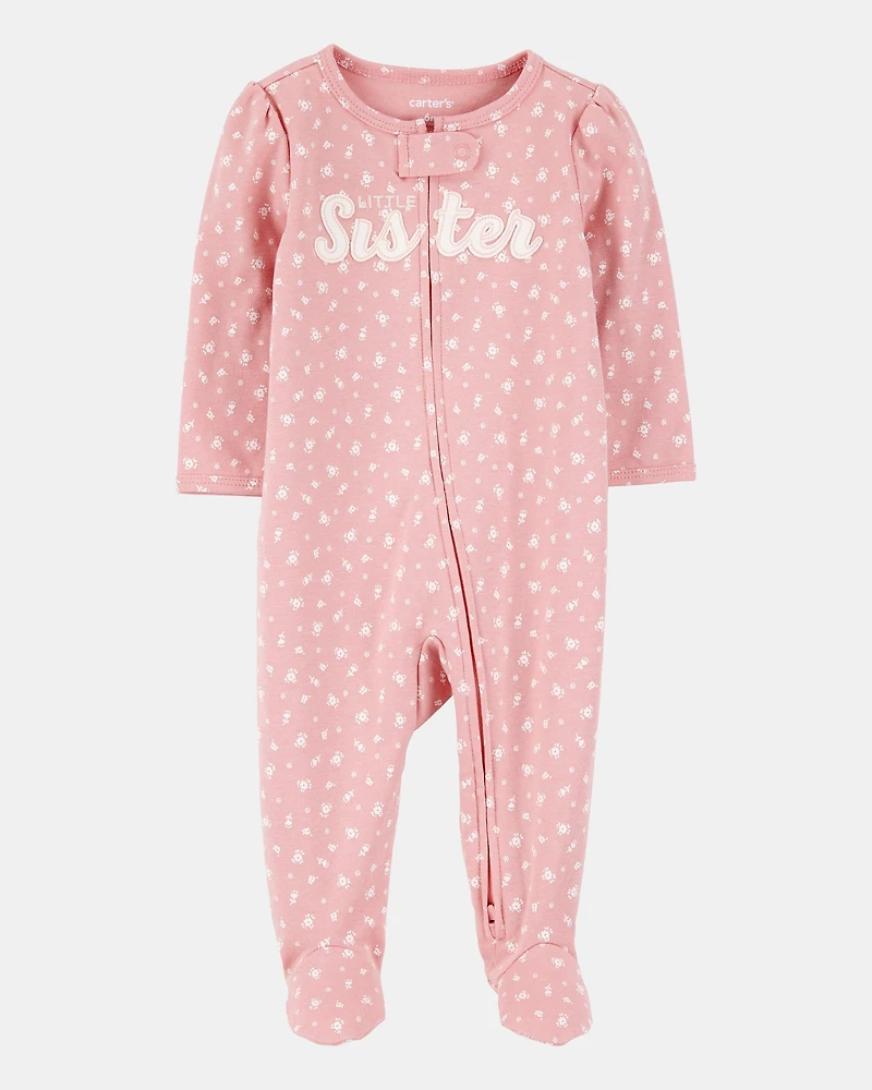 Here's a sleeper that says it all - literally. This footed 1-piece keeps your baby cozy from nap to play with a sweet "Little Sister" graphic front and center. Full-length sleeves, built-in footies and a fuss-free 2-way zip mean quicker changes and fewer outfit battles. Because newborn life is messy enough without struggling over snaps.
