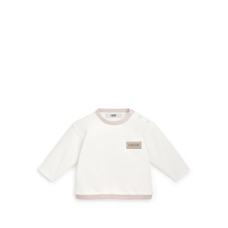 The long-sleeved T-shirt has a sleek, understated silhouette. Crafted in ivory cotton jersey, it features a contrasting beige ribbed crew neck and hem. A snap placket on the shoulder allows for easy dressing. Embellished with a beige and blue leather Dior patch on the front, the T-shirt can be worn with track pants or jeans from the collection for a laid-back look.