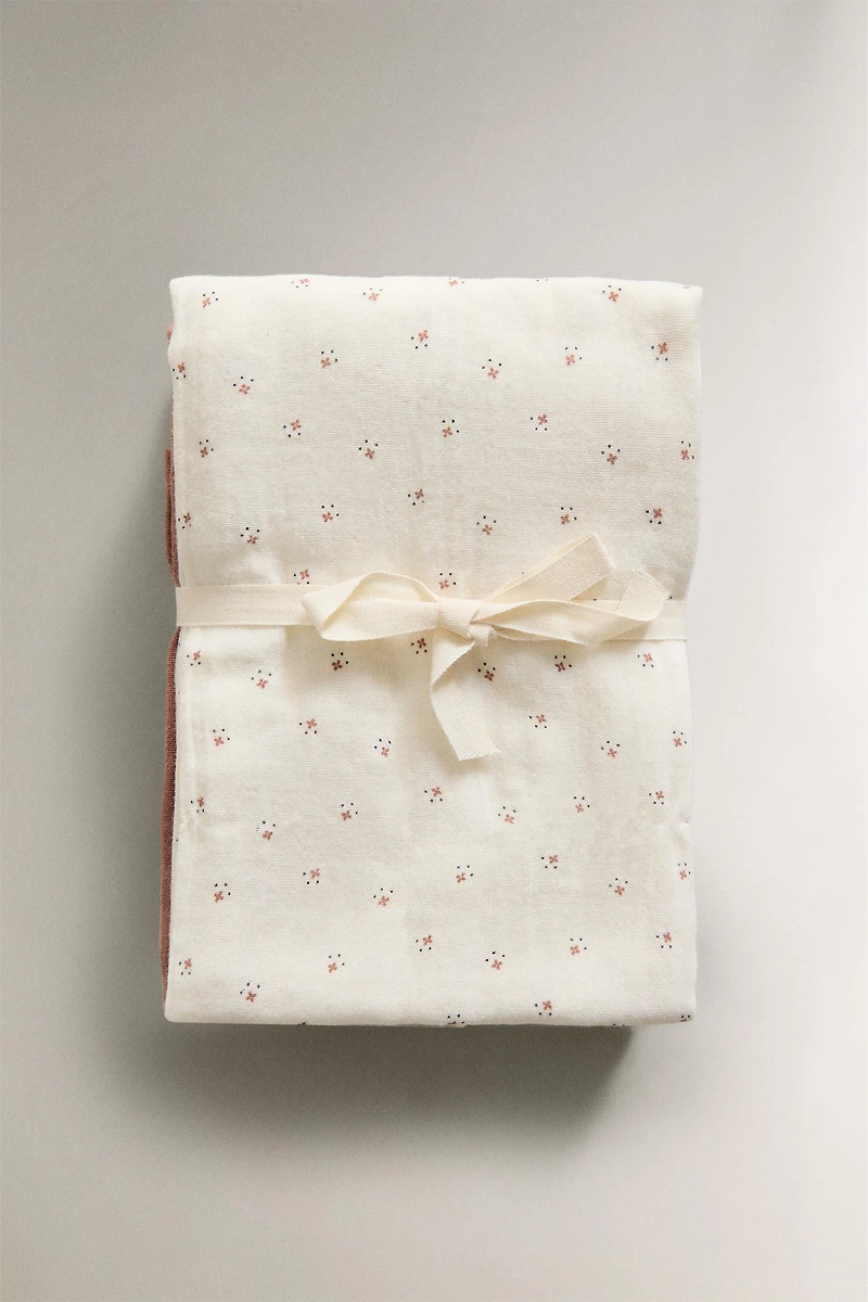 Baby muslin cloths made of cotton chiffon, two with a floral design and the other plain-coloured.