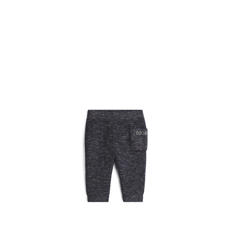 The pants showcase a comfortable, streamlined silhouette. Crafted in a midnight blue and gray wool-linen-blend ribbed mouliné knit, they present a patch pocket featuring a gray Dior embroidery on the left leg. Complete with a ribbed waistband and cuffs, the soft pants can be styled with the matching cardigan jacket from the collection for a timeless look.