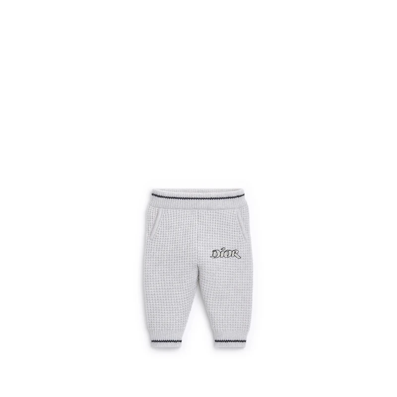 New for Spring 2026, the pants offer a timeless silhouette. Made in a light gray wool-cashmere knit, they feature slanted pockets and ribbed trim for added comfort. A tonal revisited Dior embroidery adorns the left leg, while contrasting black details add an original touch. The pants can be paired with the matching cardigan from the collection to complete a refined and laid-back look.