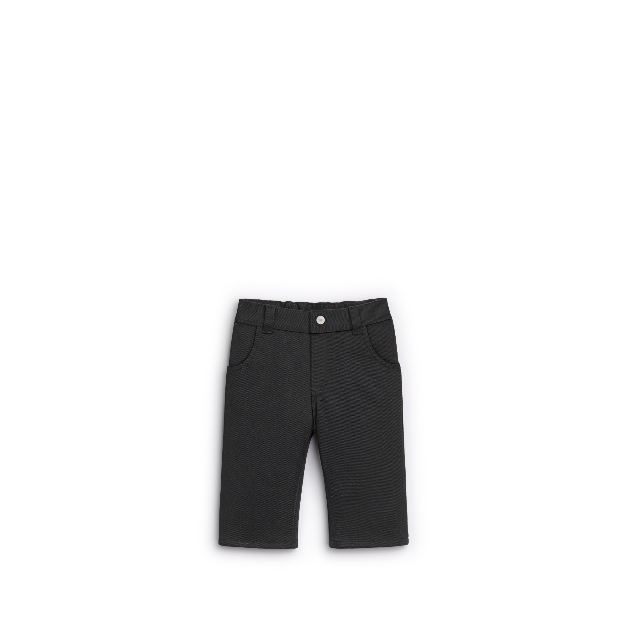The pants showcase a streamlined straight silhouette. Crafted in black cotton gabardine, they feature slanted pockets and rear patch pockets. A gray suede jacron label with a revisited Christian Dior Paris signature adds the finishing touch. Easy to slip on thanks to elastic in the back of the waist, the pants will coordinate effortlessly with a T-shirt from the collection for a timeless look.