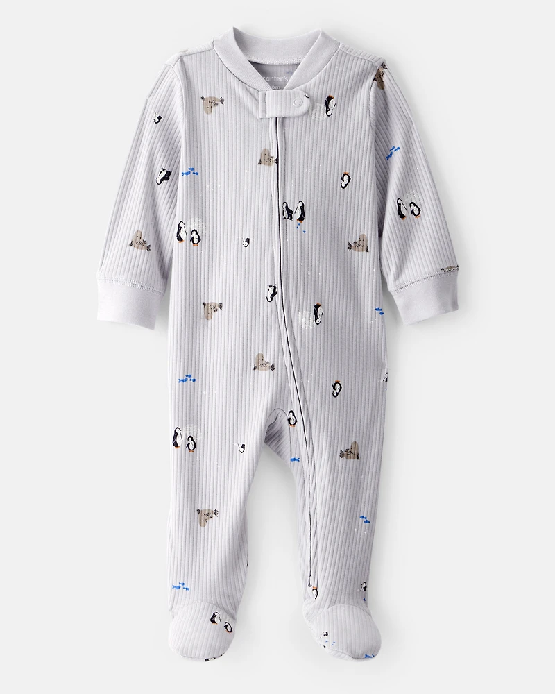 Baby Penguin Print Cotton Long-Sleeve Sleep & Play Pajamas - Grey