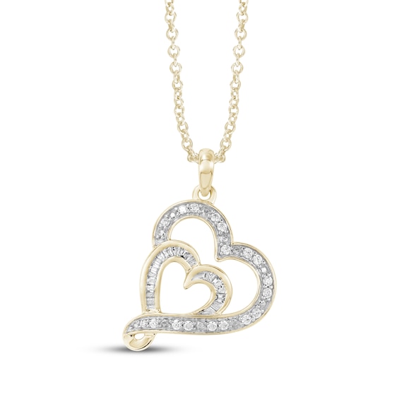 Baguette & Round-Cut Diamond Double Heart Necklace 1/6 ct tw 10K Yellow Gold 18"