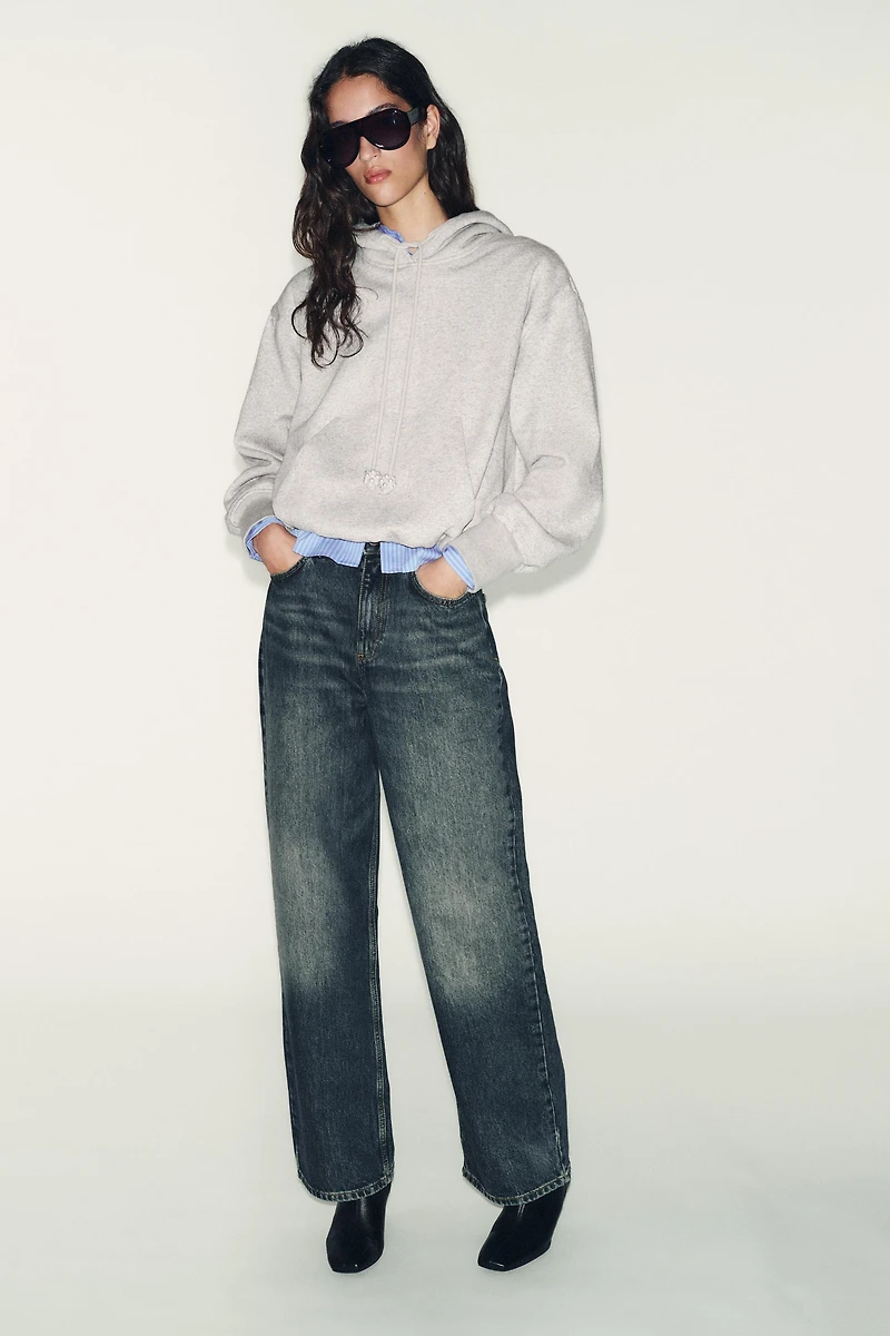 Sweatshirt with adjustable drawstring hoodie. Long sleeves. Kangaroo pocket. Balloon hem.