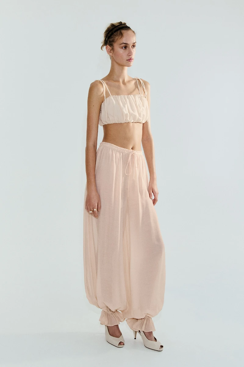 Loose-fit pants in a woven crêpe viscose blend. Low waist, elasticized waistband with a drawstring, and balloon legs with elastic at ankles and flared hems.