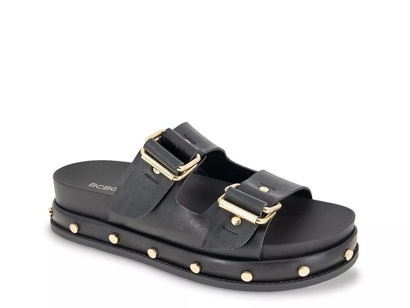 Step out with confidence in the Bamba platform sandal from BCBGeneration. Gold-tone stud embellishments at the sole add a gleaming style to this slide sandal designed with double buckle straps on the vamp for a precise fit.