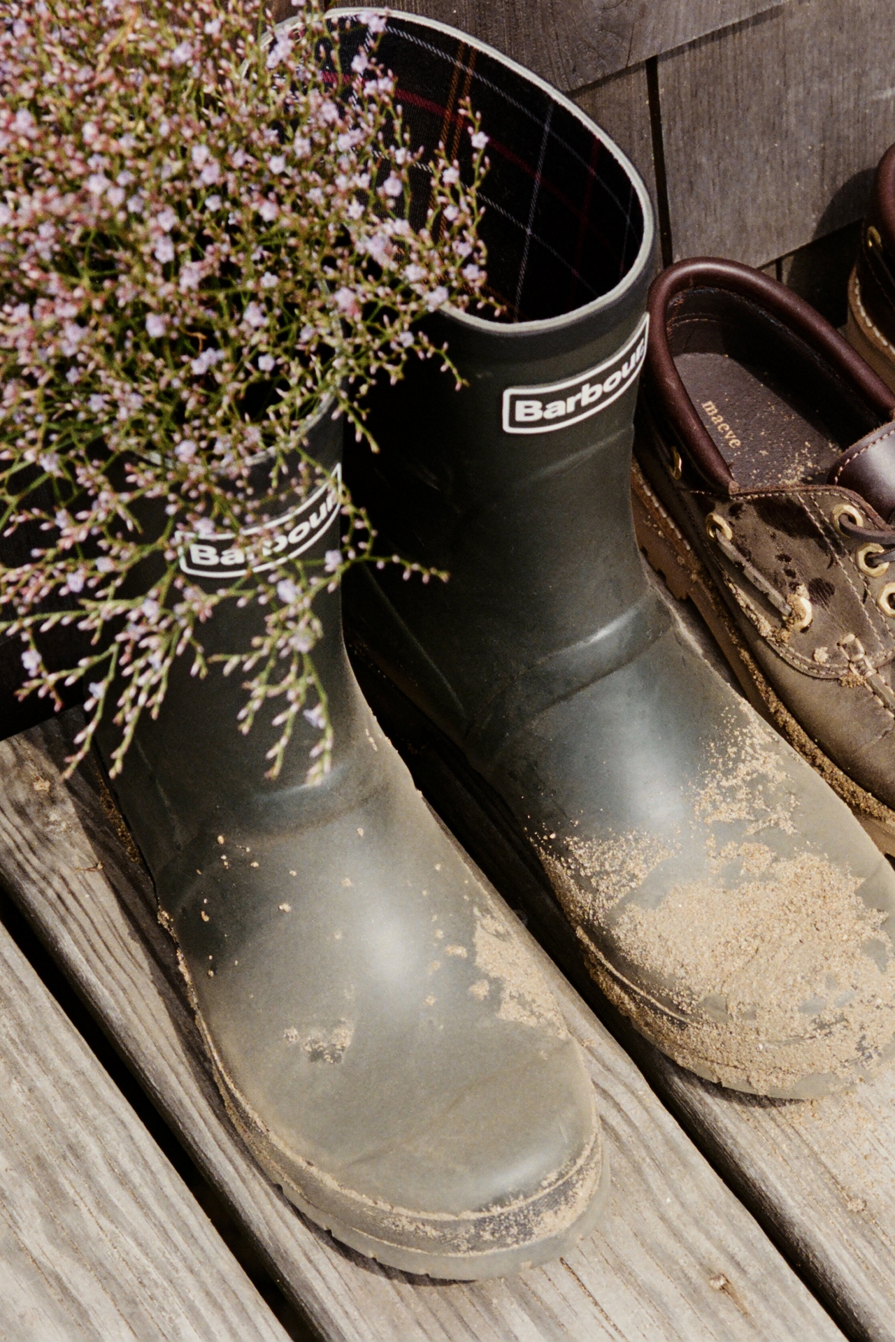 A stylish solution for rainy days, these mid-cut wellies are crafted from durable rubber with a custom Barbour outsole and tartan-pattern tread, finished with a branded back strap.