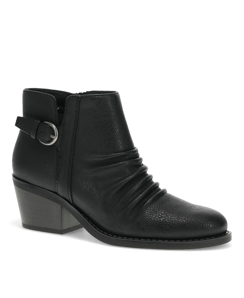 The Baretraps Linnea Ruched Bootie is a stylish and comfortable option crafted with your needs in mind. Made with materials, this bootie prioritizes design without compromising on quality.The cushioned insole provides all-day comfort, while the inside zipper closure ensures a secure and easy fit. The almond toe shape offers a sleek, modern silhouette, complemented by the eye-catching metal buckle ornament.One of the standout features of the linnea bootie is the ruching detail on the forefoot, adding a touch of texture and visual interest to the design. Topping it off is the wrapped block heel, providing both stability and a touch of height for a flattering, versatile look.