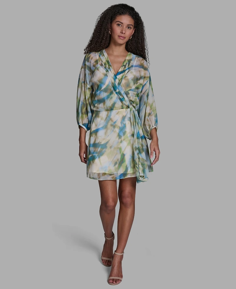 Radiate charm with this Bcbg Women's long-sleeve Faux Wrap Abstract Print Chiffon Asymmetrical Hemline Shift Mini Dress. The puff-sleeves and asymmetrical hemline create a graceful silhouette, while the abstract print adds a modern touch. Perfect for daytime elegance, this short dress is a refined choice among chiffon dresses for women.