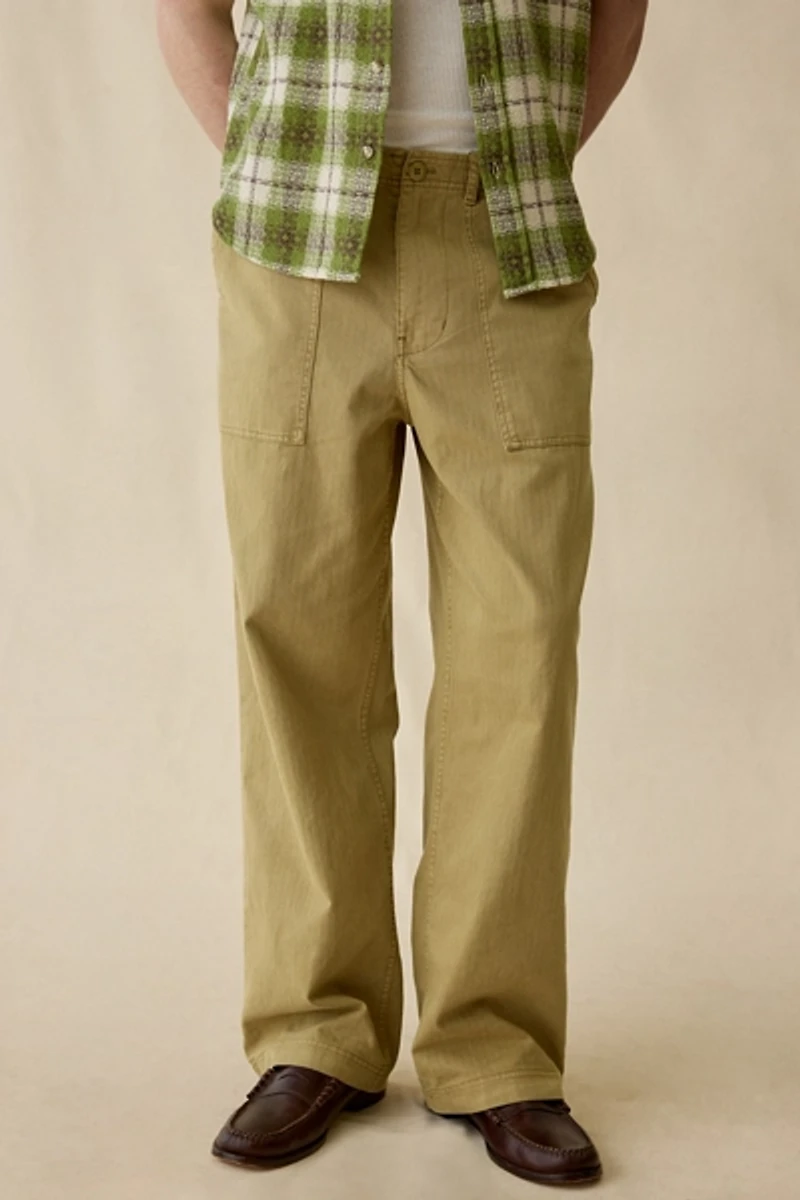 Premium utility pants by the essential BDG label, only at UO. Herringbone twill cotton pants with a mid rise waist & cut in a loose, straight leg fit. Casualwear pants to pair with tees and hoodies for a classic off-duty look. Exclusively at Urban Outfitters.