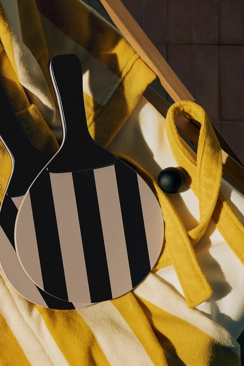 Elegant beach tennis set including two wooden rackets with a classic, striped pattern, two rubber balls, and a matching drawstring bag in cotton canvas for easy storage. Racket dimensions: Length 13 3/4 in. Width 8 3/4 in.