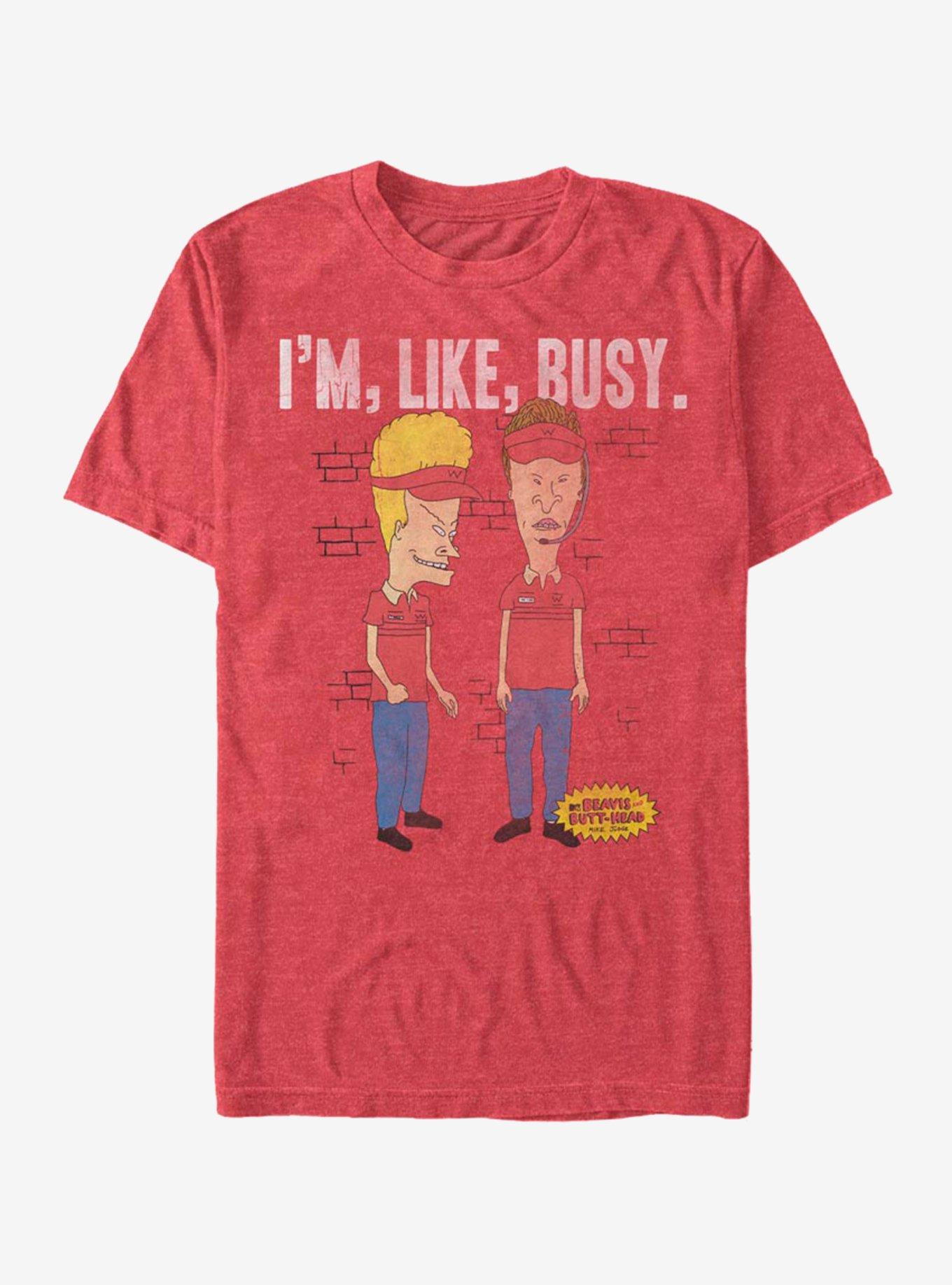 Next time you stop by Burger World, bring the Beavis and Butt-Head I'm Busy Heather Red T-Shirt. A distressed print on the front of this funny red Beavis and Butt-Head shirt reads "I'm, Like, Busy." above Beavis and Butt-Head in their Burger World uniforms. 60% Cotton, 40% Polyester.