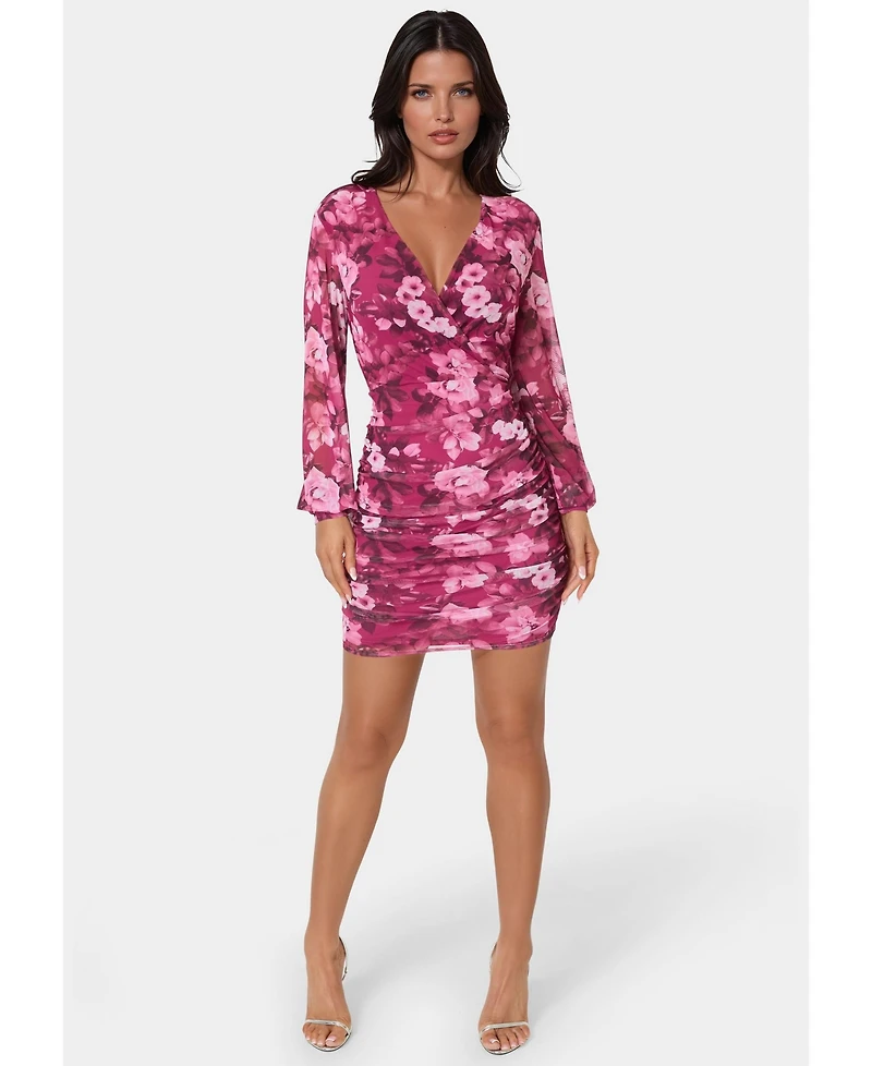 Bebe Women's Long Sleeve Faux Wrap Ruched Mini Dress
