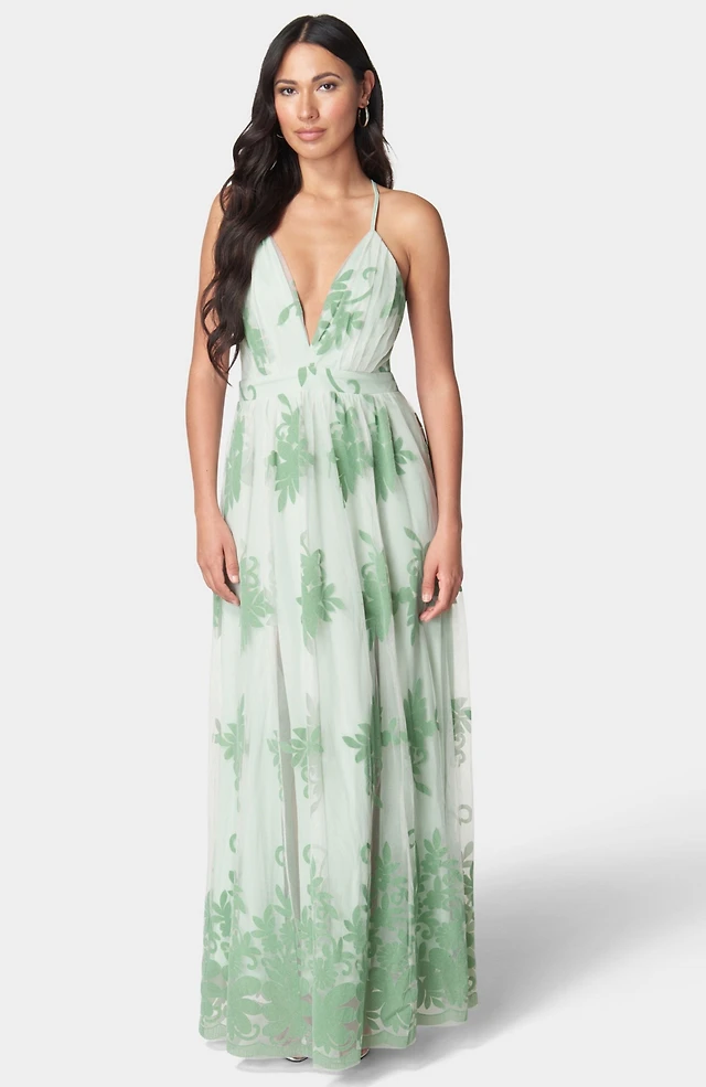 Bebe Women's Plunge Neck Embroidered Maxi Dress