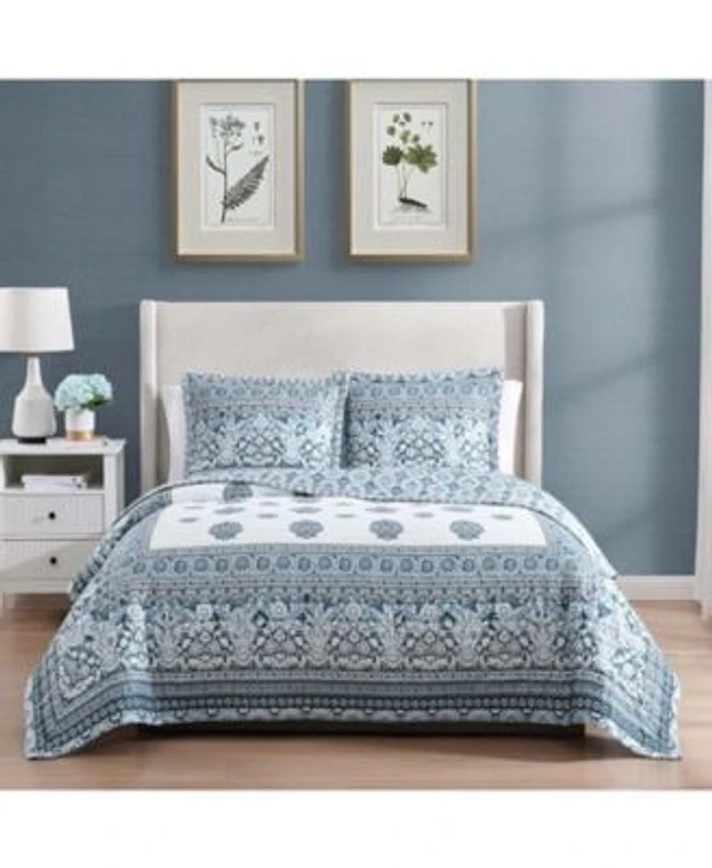 Bebejan Aquamarine Medallion 100 Cotton Sateen 3 Piece King Size Reversible Quilted Coverlet Set