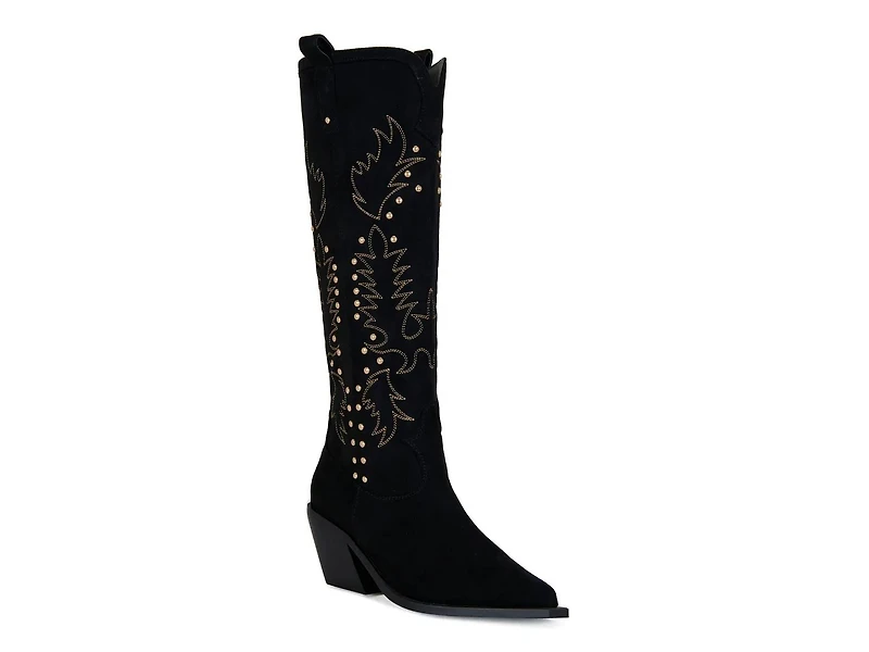 Add a touch of glam to a country-inspired style with the Beckett cowboy boot from Azalea Wang. The Western-inspired silhouette features a classic silhouette, complete with a sleek pointed toe, a block heel, and easily accessible pull straps. Decorated with elegant stitching and sparkling rhinestone details.