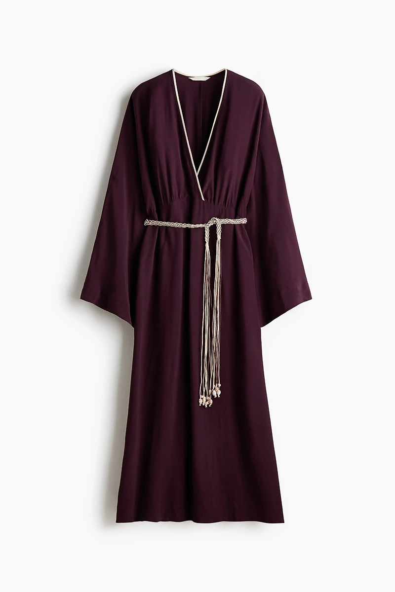 Long, oversized dress in woven viscose. V-neck with a wrapover front and contrasting piping, gathered seam at waist, and a braided, tasseled, beaded-end tie belt.