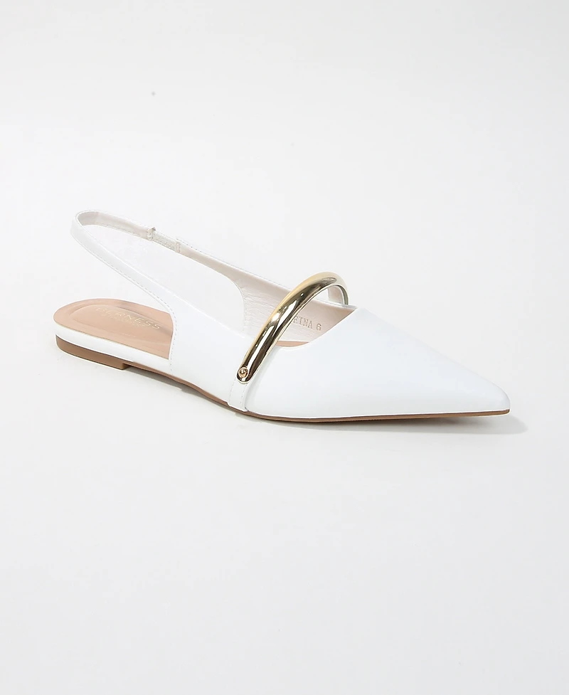 Reina pointed toe slingback flats feature a smooth man-made leather upper accented with a domed gold bar detail for a chic look.