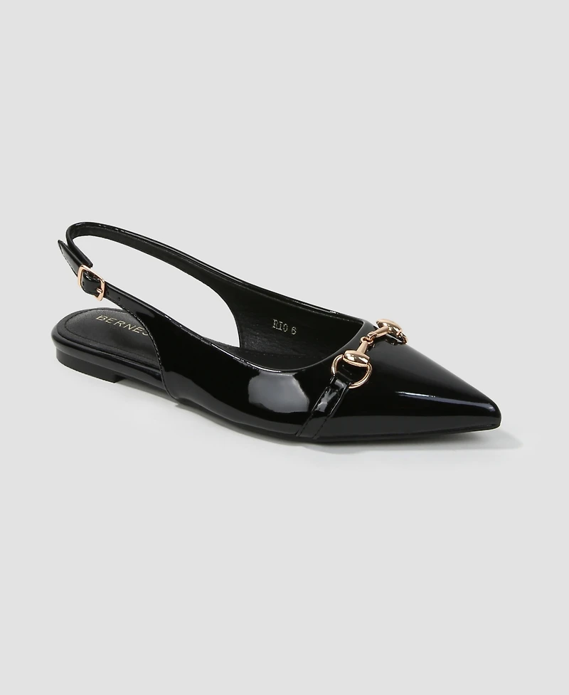 Rio pointed toe flats feature a glossy patent upper with a gold-tone bit accent for a chic detail with an adjustable slingback strap.