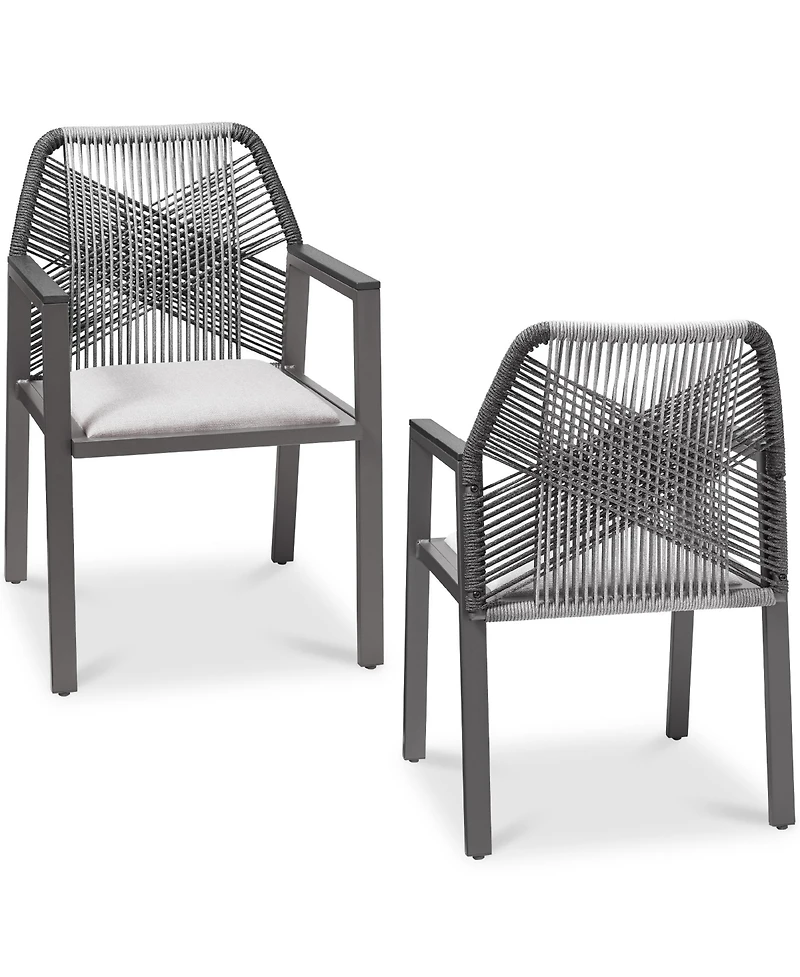 Get ready to elevate your outdoor dining experience with our all weather woven rope dining armchairs! This set of 2 features an intricate woven rope design crafted with olefin material. The woven rope is not only modern, but resistant to stains and fading! Built-in cushions are ready to use, offering a comfortable and plush surface for dining relaxation. The sleek and lightweight aluminum frame holds up to 330 lbs, while the smooth wooden armrests provide a cooler touch compared to metal on a hot day. Built to last, this versatile set is both elegant and functional, perfect for your living room or kitchen, and everywhere outdoors!