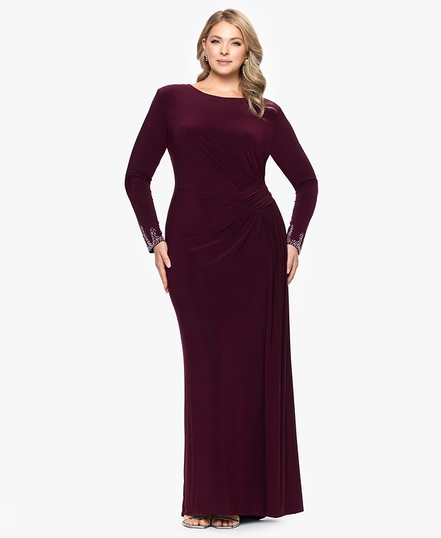 Betsy & Adam Plus Size Scoop Neck Long-Sleeve Ball Gown