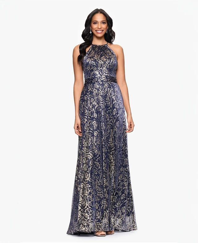 Betsy & Adam Women's Metallic-Print Halter Gown