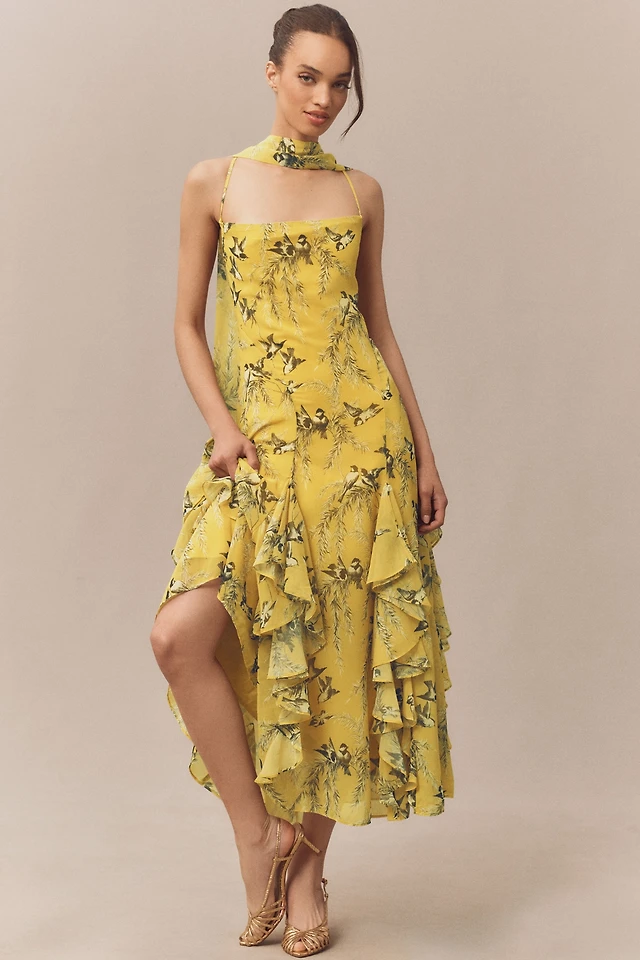 BHLDN Chiffon Cowl-Neck Cross-Back Ruffle Midi Dress