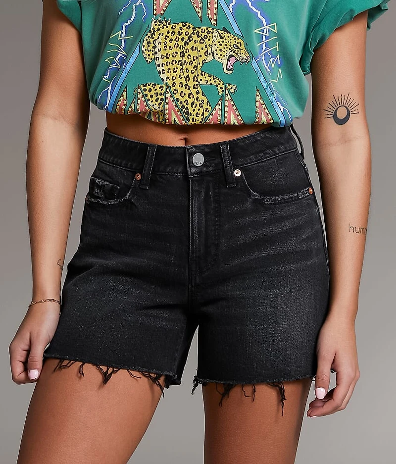 High rise Slim through the hip and thigh 4" midi short Frayed hem details