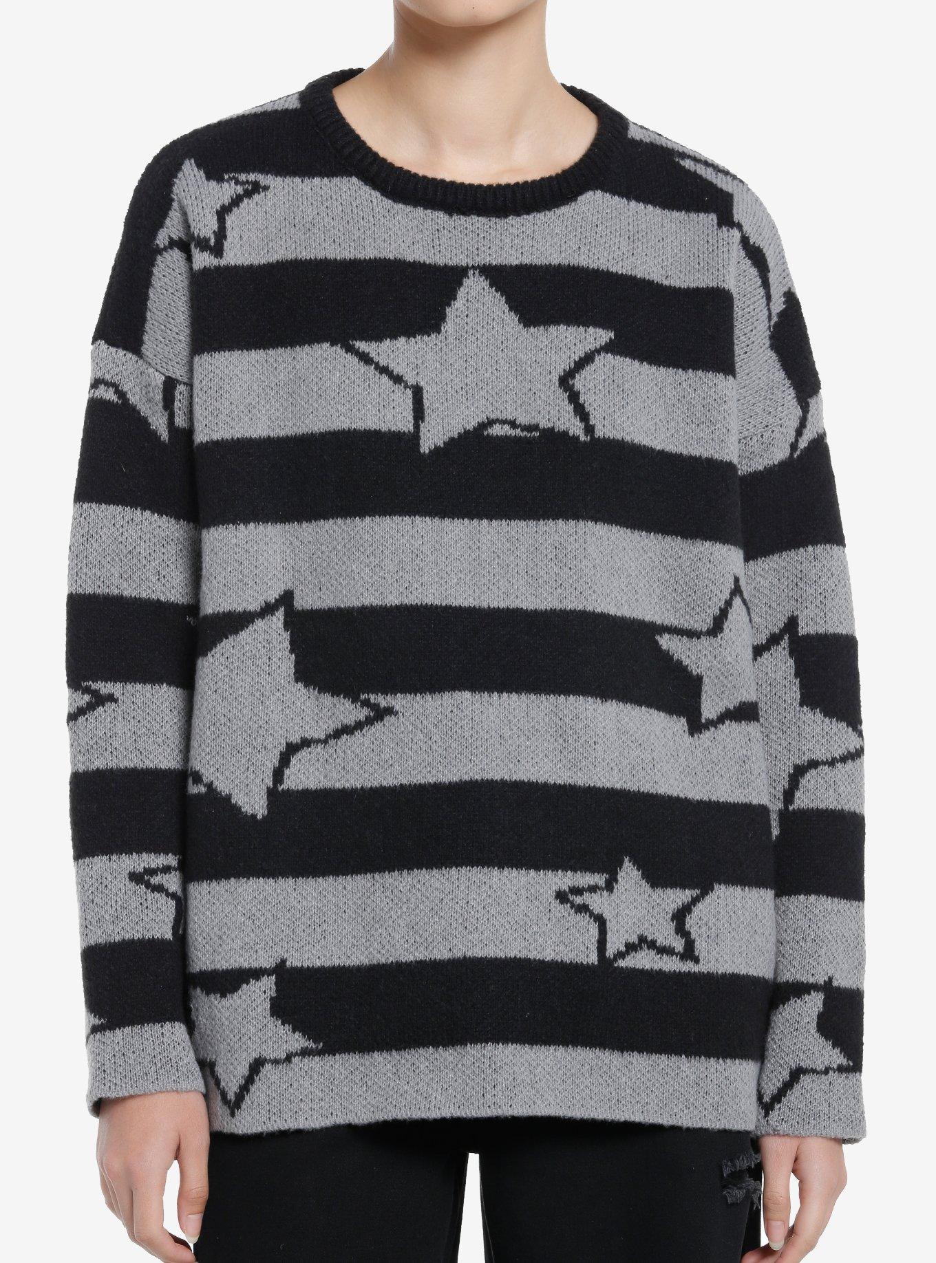 Black & Grey Stripe Star Girls Oversized Boxy Knit Sweater