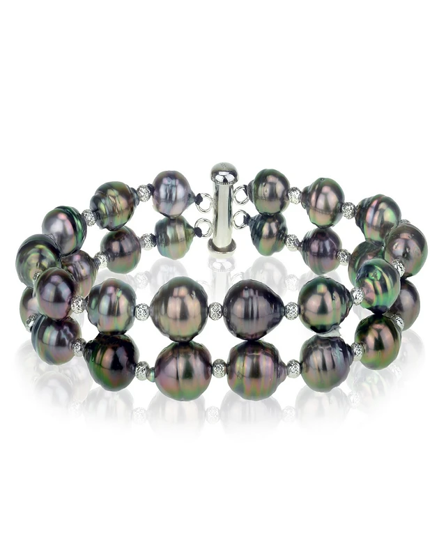 Black Tahitian Cultured Pearl (8-10 mm) Double-Row Bracelet in Sterling Silver
