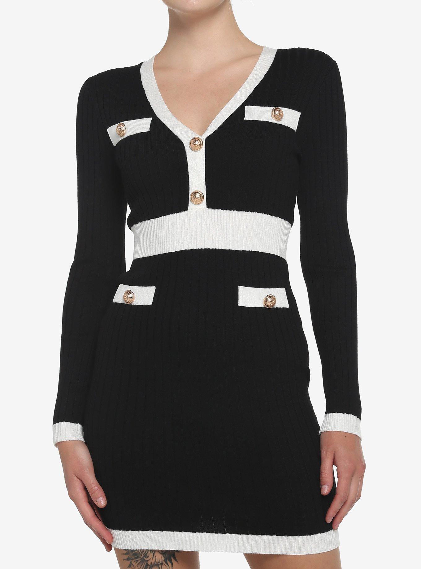 Want to add a luxurious vibe to your dress collection? This rib knit dress looks like a fancy suit dress thanks to its gleaming gold buttons with faux crests on them, faux pockets and white detail.