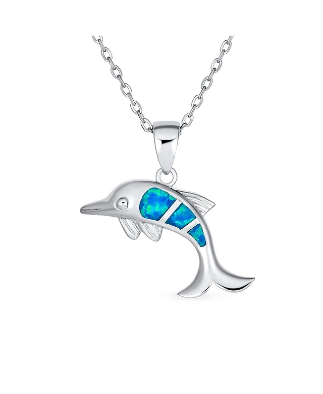Bling Jewelry Created Blue Opal Inlay Nautical Ocean Marine Hawaiian Vacation Sea Life Dolphin Dangling Pendant Necklace .925 Sterling Silver