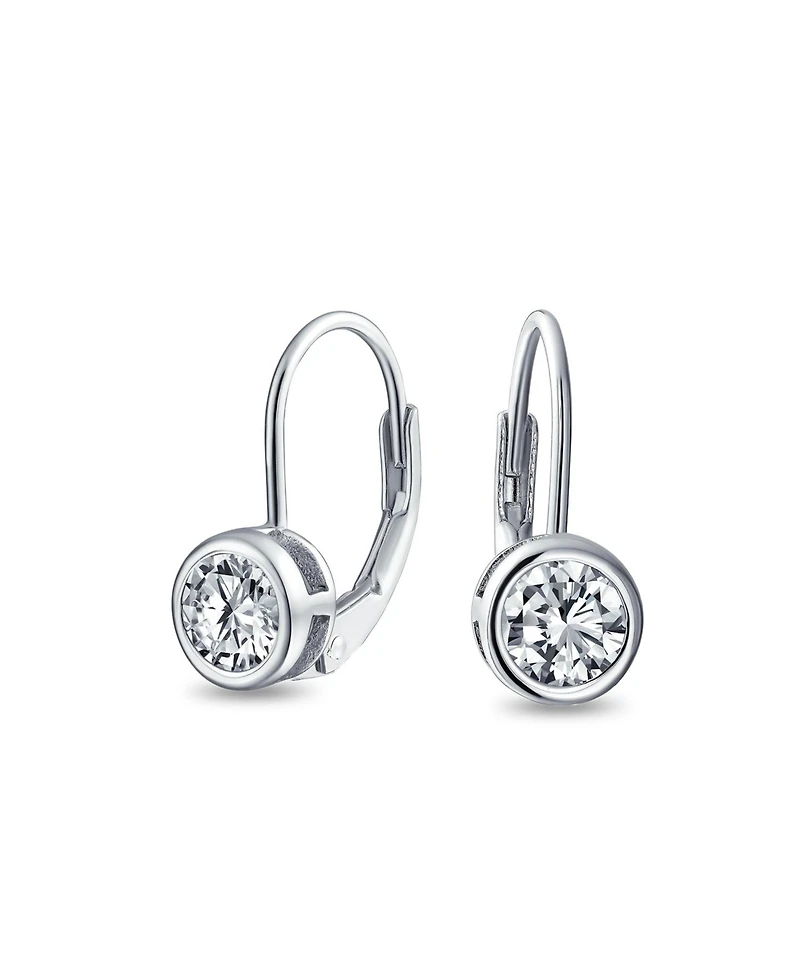 For an element of understated sophistication with irresistible shine, choose these rhodium plated sterling silver leverback drop earrings. Accented by a 5mm, round bezel set cz stone.
