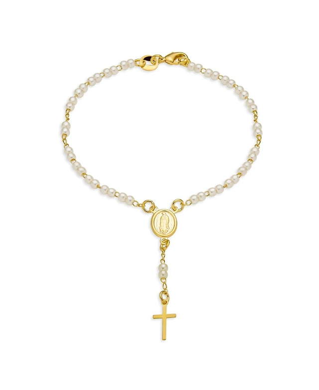 Bling Jewelry Dainty White Pearl Rosary-Bead Bracelet with Cross Gold Plated 7.5 Inch