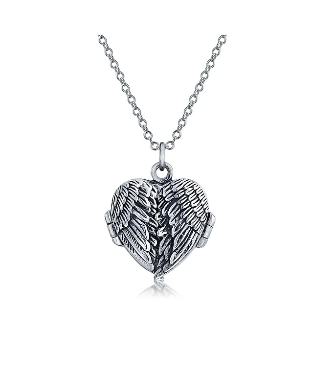 Bling Jewelry Dome Large Guardian Angel Wing Feathered Heart Shaped Photo Locket Holds Photos Pictures Oxidized Silver Necklace Pendant
