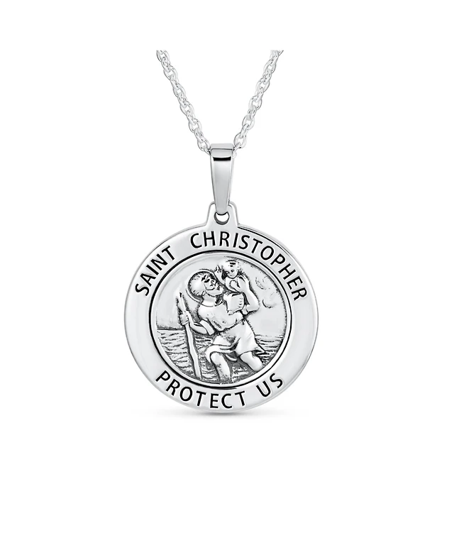 Bling Jewelry Large Size Patron Of Safe Travel "Protect Us" Religious Medal Medallion Round Saint Christopher Pendant Necklace Sterling Silv