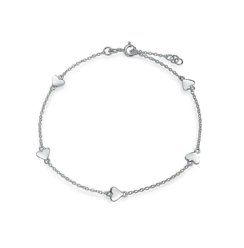 Hearts are flirty and feminine, the many dangling hearts are flat and add a very pretty look to the sterling silver heart ankle foot bracelet. Delicate dainty but strong charm heart anklet is on rolo chain. It a perfect gift of all ages and any occasion. It fastens securely with a spring ring clasp that features an extender.