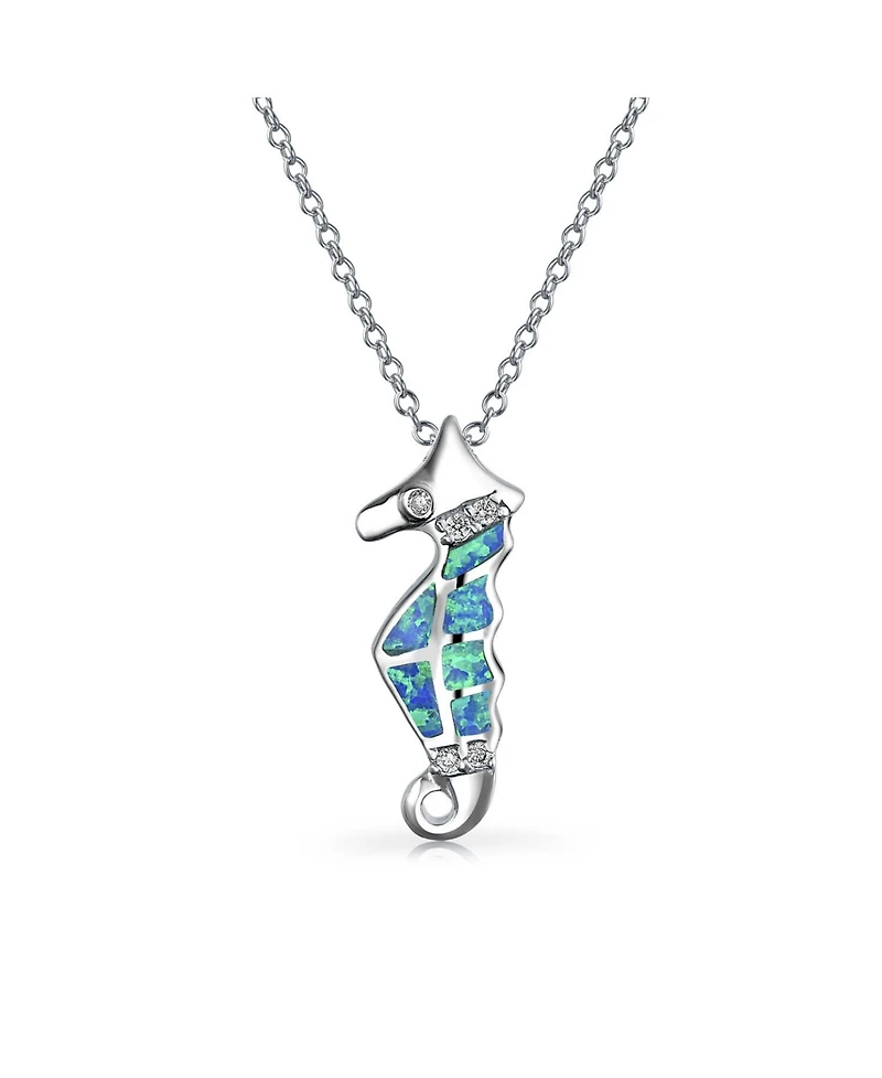 Bling Jewelry Sea Animal Nautical Created Blue Opal Seahorse Pendant Necklace Sterling Silver