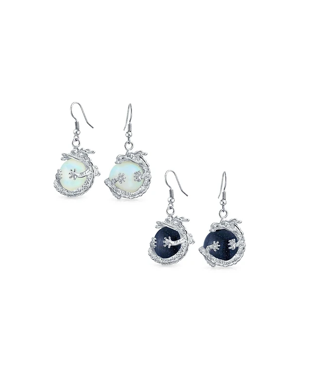 Bling Jewelry Set of 2 Rainbow Dangle Earrings Opalite Blue Goldstone Round Ball Dragon Design