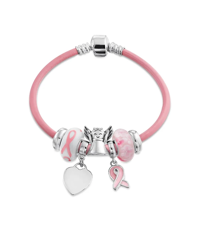 Bling Jewelry Support Breast Cancer Survivor Angel Pink Ribbon Multi Bead Charm Leather Bracelet .925 Sterling Silver