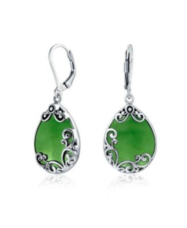 Bling Jewelry Western Style Teardrop Scroll Ornate Filigree Scroll Dyed Natural Quartz Green Color Lever Back Dangle Earrings Sterling Silver